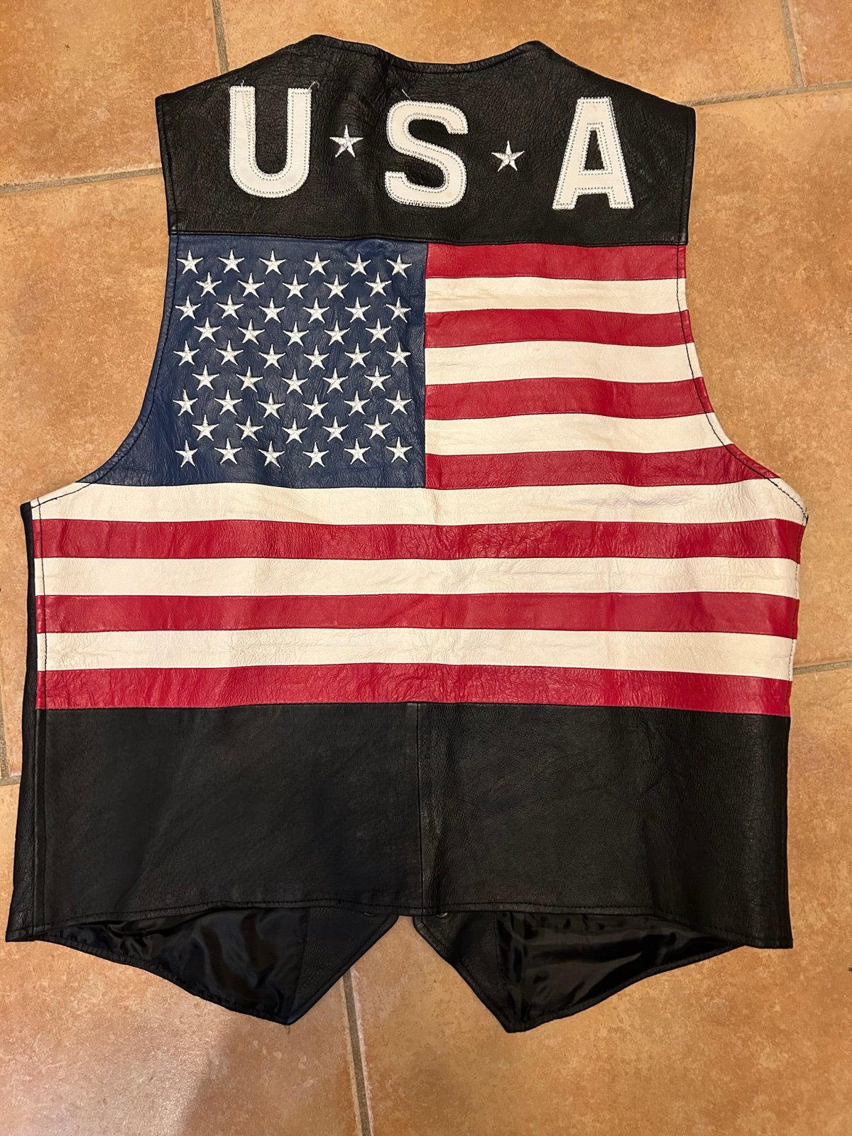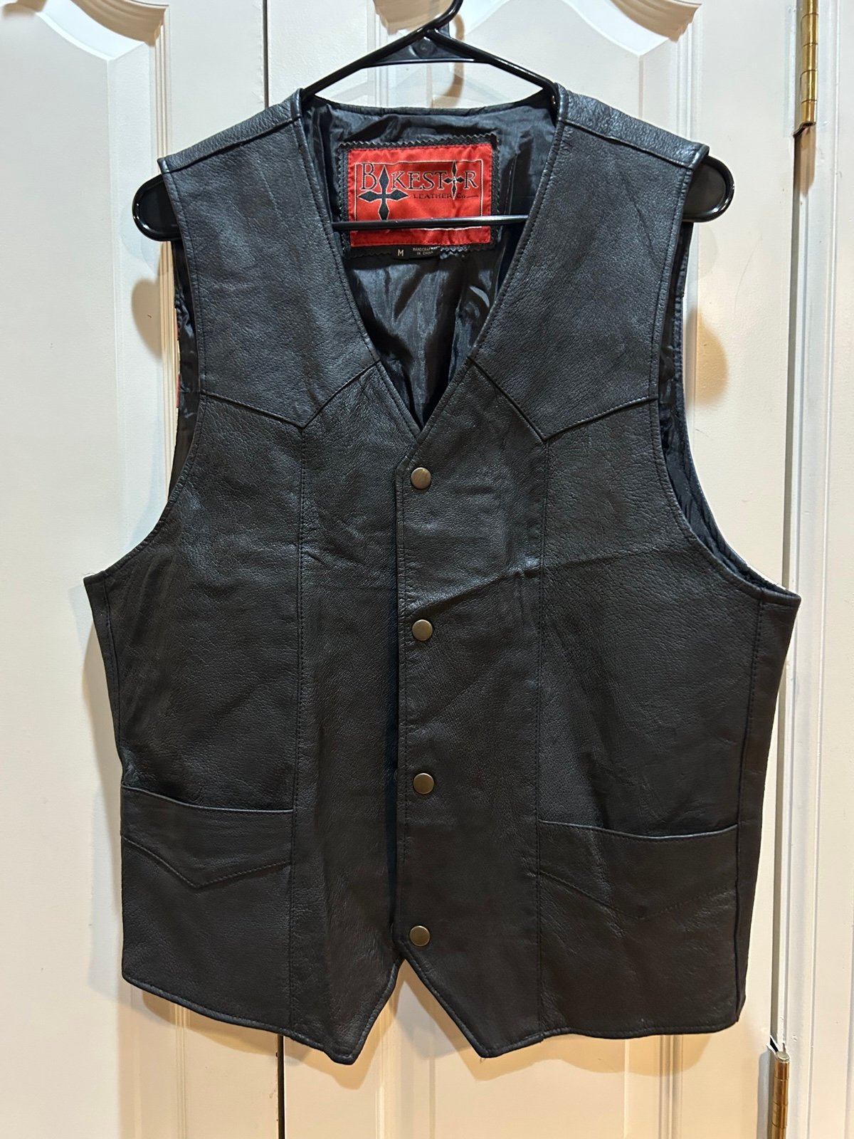 Very nice. Handmade bike star black leather USA biker motorcycle vest. Metal Snap buttons. Embroidered USA lettering on back. Two inside pockets. Two outside pockets. Men medium. Fits chest 38 to 40 inches. Measures 25 inches from shoulder to hem